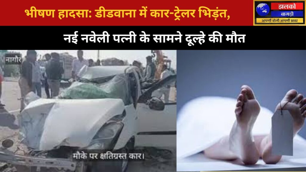 दिदवाना के पास बुधवार शाम एक दर्दनाक सड़क हादसा हुआ, जिसमें नई शादी के बाद दुल्हा-दुल्हन ननिहाल जा रहे थे। घटना में युवक की कार का सामना ट्रेलर से हो गया, जिससे कार पूरी तरह क्षतिग्रस्त हो गई। हादसे में दूल्हा संदीप कुमार (28) और उसकी बहन रीता देवी (24) की मौके पर ही मौत हो गई, जबकि दुल्हन प्रीति (22) गंभीर रूप से घायल हो गई।