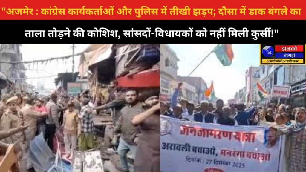 राजस्थान के अजमेर में कांग्रेस कार्यकर्ताओं और पुलिस के बीच झड़प की स्थिति बन गई, जबकि दौसा में कांग्रेस नेताओं और कार्यकर्ताओं ने डाक बंगले का ताला तोड़ने का प्रयास किया। दोनों घटनाओं ने राज्य की राजनीति में हलचल बढ़ा दी है और प्रशासनिक तैयारियों पर भी सवाल खड़े किए हैं।