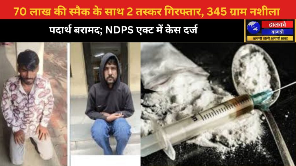 जयपुर (राजस्थान) — राज्य में स्मैक तस्करी के खिलाफ जारी पुलिस कार्रवाई के तहत महत्वपूर्ण सफलता मिली है। राजस्थान पुलिस ने 345 ग्राम अवैध स्मैक जब्त किया है, जिसकी अनुमानित बाजार कीमत लगभग 70 लाख रुपये बताई जा रही है। इस मादक पदार्थ तस्करी के मामले में पुलिस ने दो आरोपी को गिरफ्तार किया है और उनके खिलाफ एनडीपीएस एक्ट (NDPS Act) के तहत मामला दर्ज किया गया है। Dailymotion